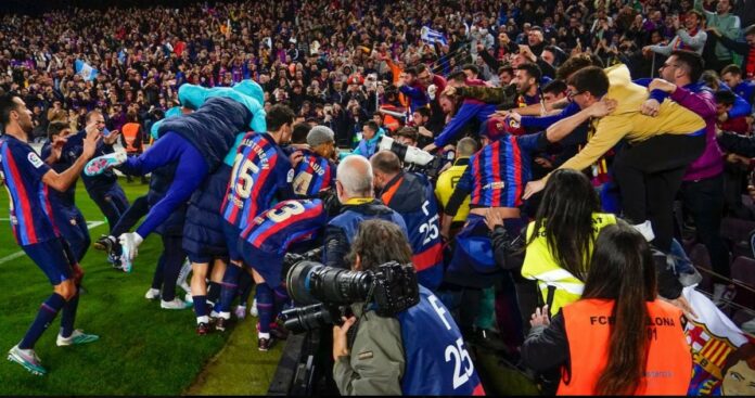 Chelsea-spissen Pierre-Emerick Aubameyang ble med Barcelonas spillere for å feire 2-1-seieren over Real Madrid søndag kveld.