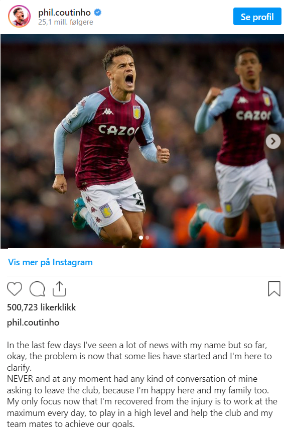 -De siste dagene har jeg sett en masse rykter som handler om meg. Problemet er at det florerer en masse løgner, derfor trenger jeg å klarlegge noen ting, begynner Coutinho på Instagram-kontoen sin.