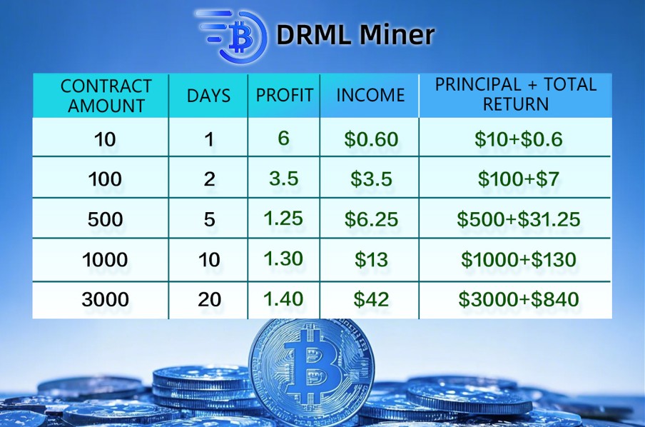 1: Registrer deg nå for å få en bonus på $10 ($0,60 for daglige pålogginger). 2: Velg en kontrakt: Etter at du har registrert deg, er neste trinn å velge en gruvekontrakt som passer dine mål og budsjett. DRML Miner tilbyr en rekke kontrakter som passer ulike behov, enten du er nybegynner eller en erfaren gruvearbeider. Ta en nærmere titt på de tilgjengelige alternativene, og vurder faktorer som kontraktslengde, potensiell avkastning og tilhørende kostnader. 3: Begynn å tjene penger: Når du har valgt og aktivert gruvekontrakten din, kan du lene deg tilbake, slappe av og la systemet gjøre jobben for deg. DRML Miners avanserte teknologi sikrer at gruvedriften din går effektivt og maksimerer potensielle inntekter. Velg en kontrakt som passer din investeringsstrategi: