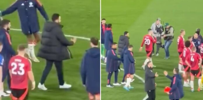 I bilder lagt ut av en United-supporter som var til stede på stadion, viser Amorim samle spillerne sine for å få dem til å gå over til bortesupporterne sine som hadde tatt veien til Ipswich.