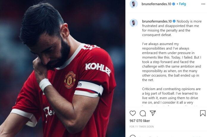 Bruno Fernandes er lei seg over sitt mislykkede straffespark mot Aston Villa, men Manchester United -profilen uttaler at han er klar til å gå frem til krittmerket igjen. – Det kan være greit å minne om at ingen, absolutt ingen scorer 100% selv ikke en spiller med ekstreme kvaliteter som Bruno Fernandes.