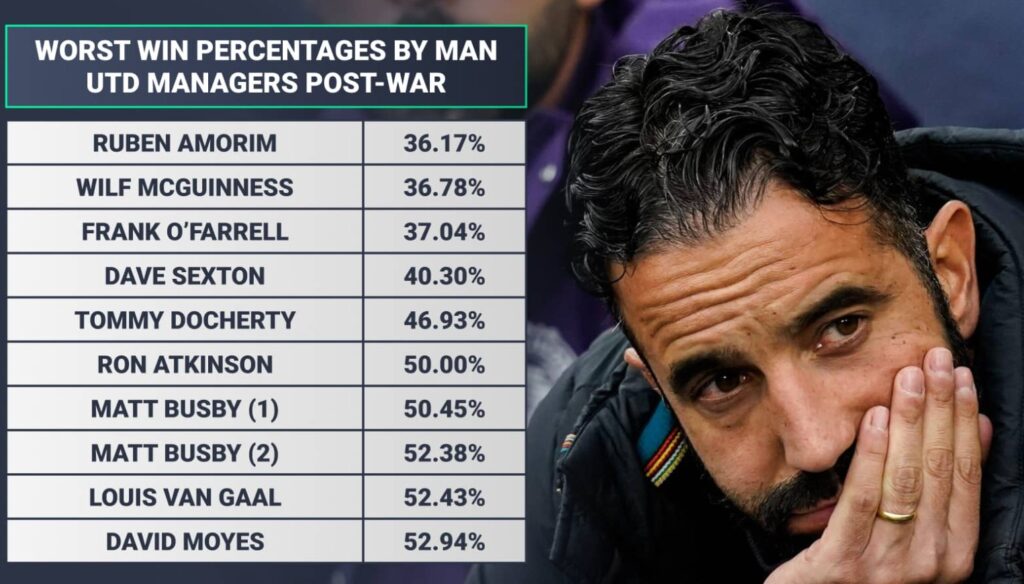 Manchester Uniteds under Ruben Amorim har ikke vært dårligere siden krigen.