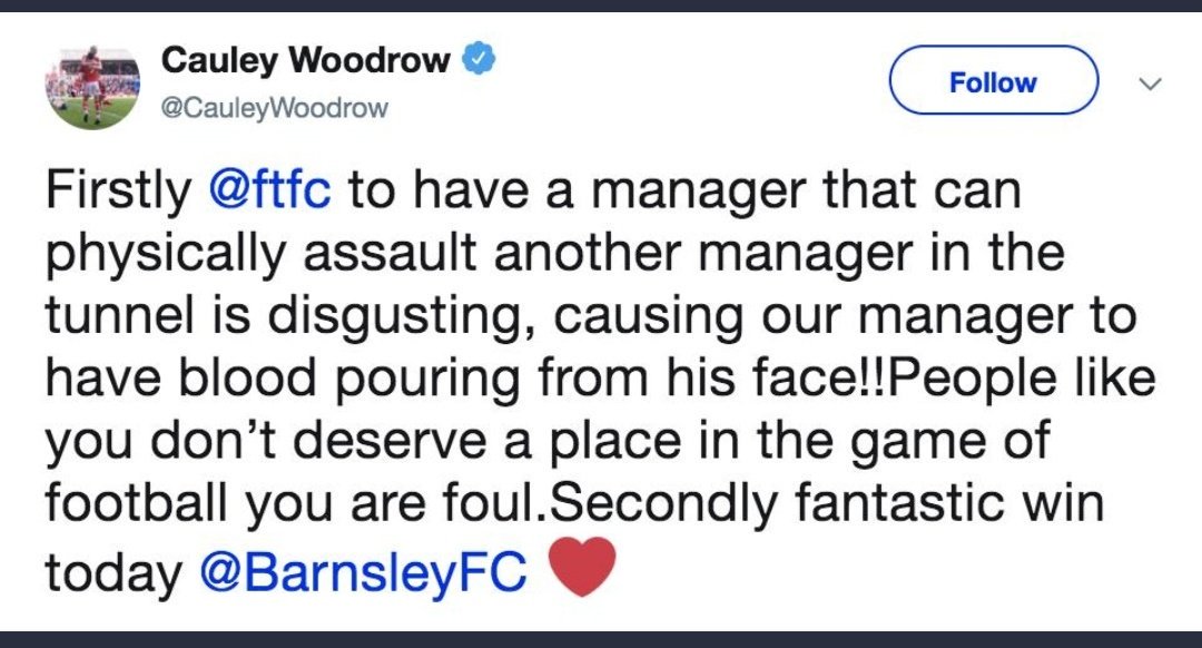 Barnsley-spiller Cauley Woodrow skrev på Twitter at Barton angrep Stendel i spillertunnelen etter at Fleetwood tapte 2–4. Ifølge spilleren rant blodet fra ansiktet til Barnsley-manageren. Woodrow slettet meldingen, men Barnsley bekreftet i en pressemelding at det har skjedd en hendelse som politiet etterforsker.