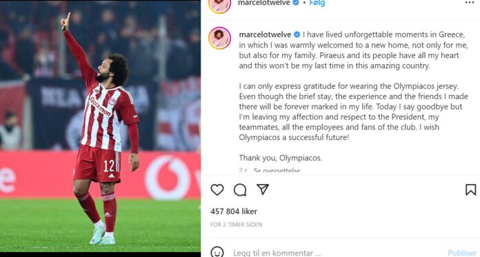 Tre mål på ti kamper og det var det et halvt år før tiden: «Hele Olympiakos-familien vil takke Marcelo for hans samarbeid og tilstedeværelse i klubben.»