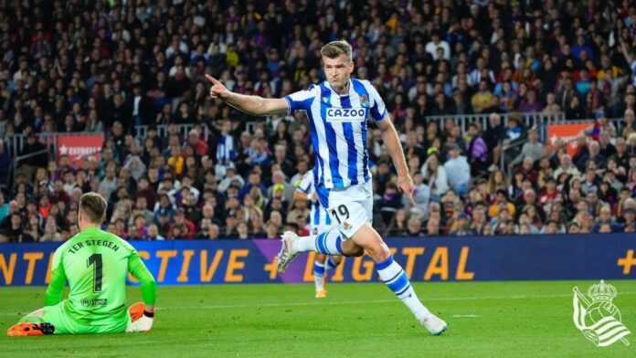 Ni minutter før full tid ble Sørloth tatt av banen etter sin praktkamp. Åtte minutter senere reduserte ligaens toppscorer Robert Lewandowski for Barcelona, men Sørloth og hans lagkamerater kan likevel pakke med seg alle poengene hjem til San Sebastián.