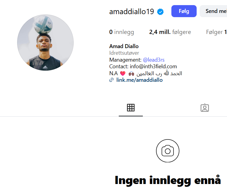 Med 2,4 millioner følgere, ble det noe flere enn nærmeste familie og venner som fikk opp bildet. Dette var lørdag kveld, på søndag er bildet fjernet og alt av annet innhold på profilen. Vi tipper det har kommet reaksjoner fra Man Utd-supportere som har uttrykt hva de syntes om kompis-bildet med Garnacho.