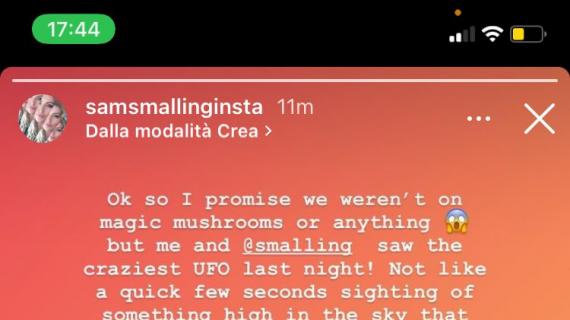 Jeg har alltid vært litt skeptisk, men når selveste Chris Smalling og hans kone Sam Cooke Smalling har sett en UFO med egne øyne må man bare tro. Roma-forsvarer Chris Smalling (som var Manchester United spiller i neste 10 år) og kona Sam så en UFO i går kveld. ‘Chris kunne se det rotere med lys som blinker i alle retninger.’